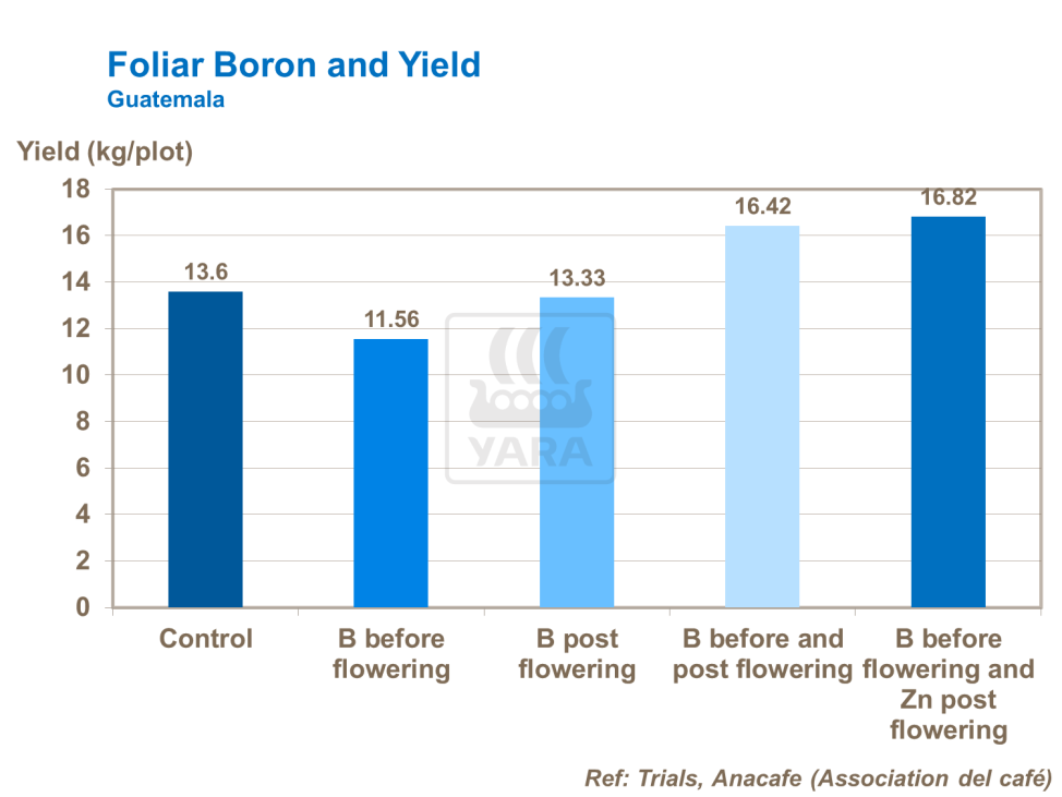 硼参与了碳水化合物的代谢和核酸合成过程。因此,如果咖啡缺硼,根系生长、开花和坐果都会不理想。试验表明,在花期前后叶面施硼(最好结合锌)可以取得最佳的咖啡产量。