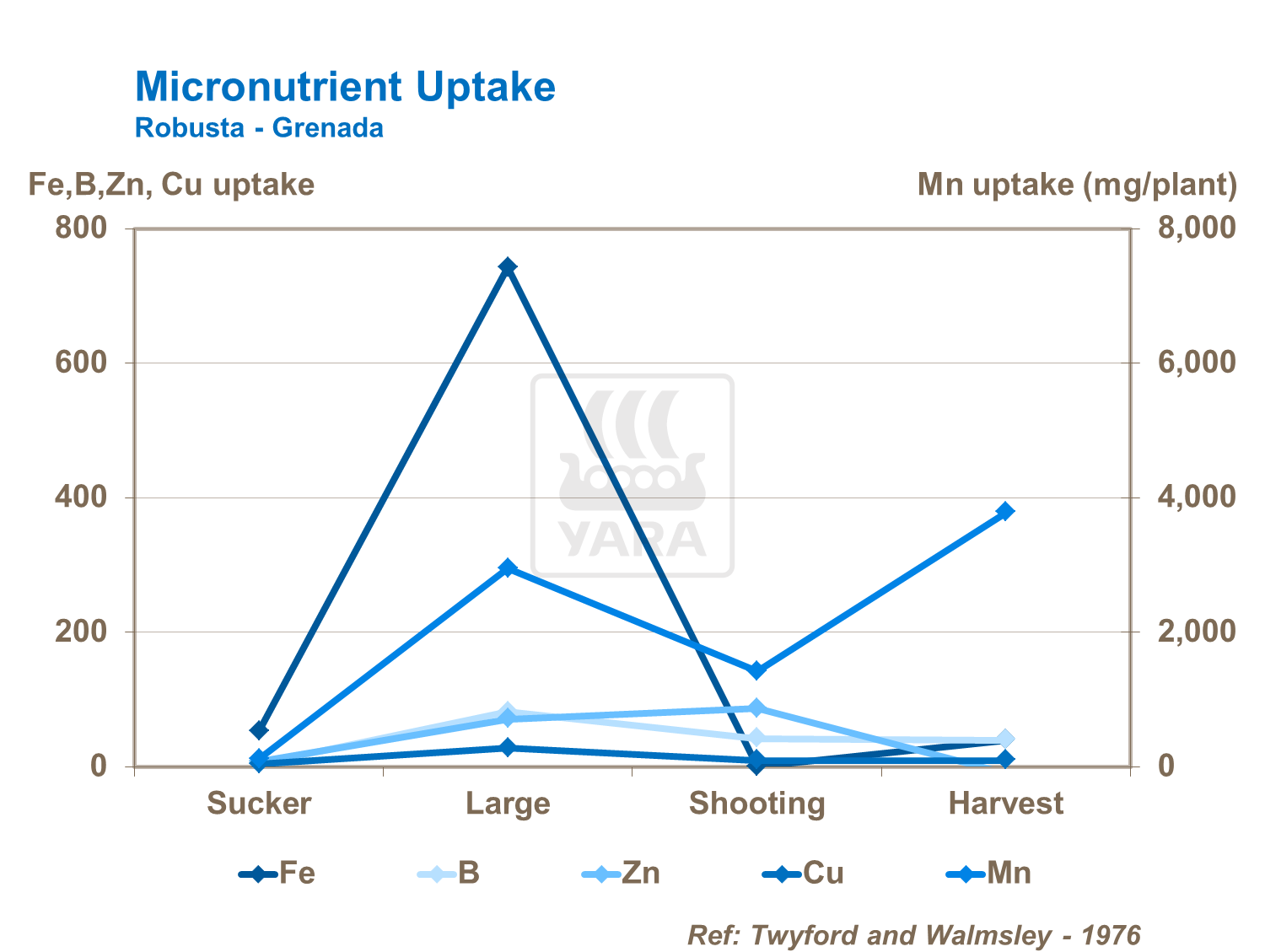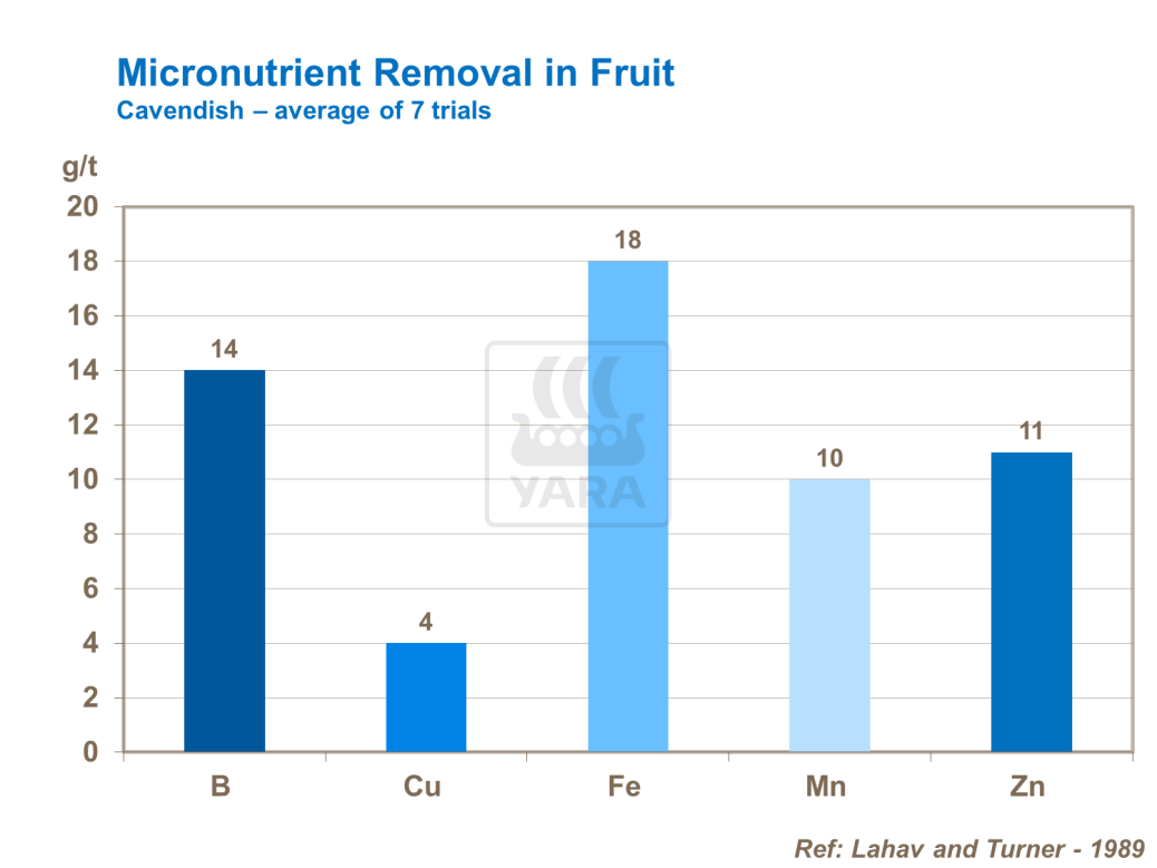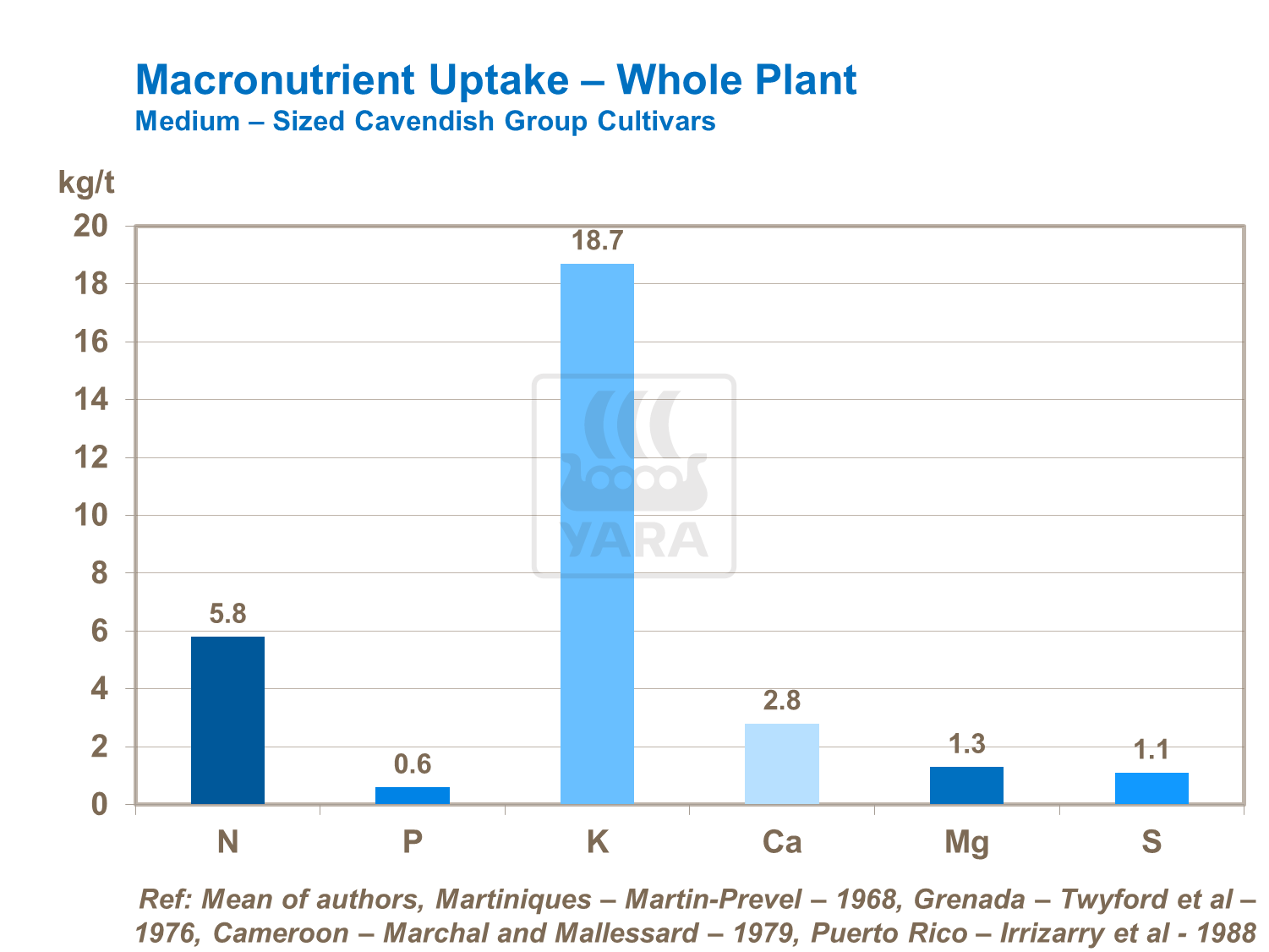 整个生长季香蕉对镁的需求量相对比较均匀。氮、磷和钾吸收总量的 30-40% 都能转运到果穗,只有 10-15% 的钙和镁能够转运到果肉。但对于果实的完整性、长期储存以及香蕉的总产量而言,钙和镁的作用至关重要。
