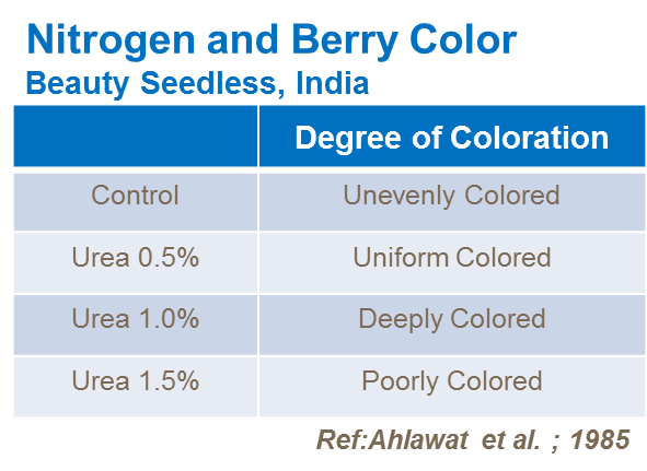 低氮情况下,坐果后对叶面喷施尿素(低缩二脲)可以改善葡萄的颜色。然而,氮过量也会影响葡萄的颜色。进入转色期后,修剪叶片可以大大减少这一影响。