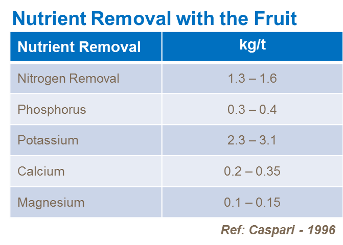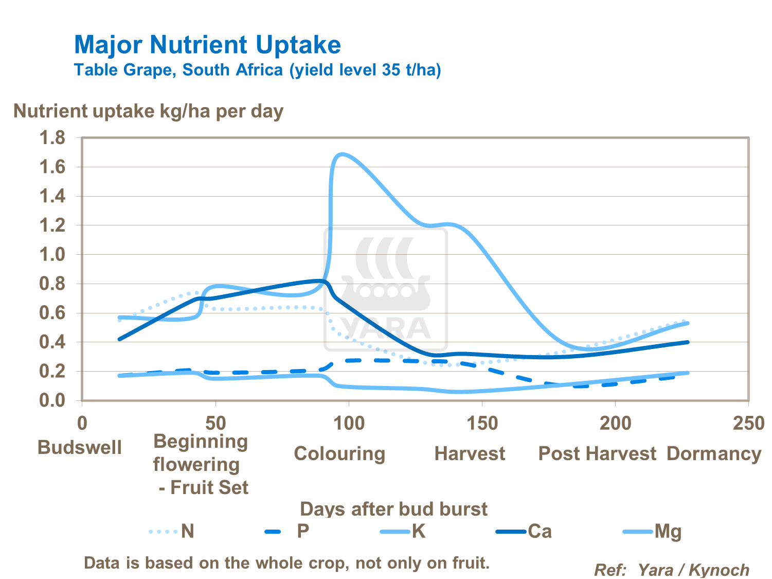 作物对钾的需求量通常大于氮。相对高产的鲜食葡萄果实带走钾的量几乎是氮的两倍。南非试验证明,钾吸收量可高达 200 公斤/公顷,明显高于氮的吸收量。然而需要注意的是,过量施钾会降低镁和/或钙的利用率。